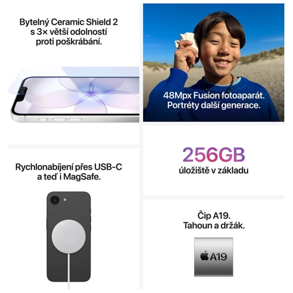 - Procesor: Apple A19 (6jádrové CPU, 4jádrové GPU, 16jádrový Neural Engine)